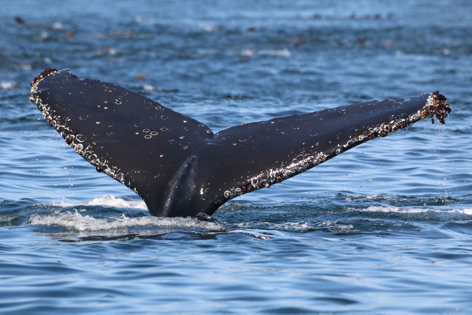 The whale rises again close to our port side, then our starboard side, and is soon identified as whale CRC-19874. CRC-19874 has been seen 32 times since 2021 and only ever within Monterey Bay.